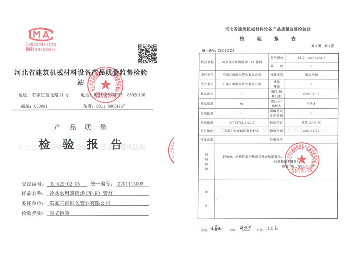 冷熱水用聚丙烯(PP-R)管材檢驗報告